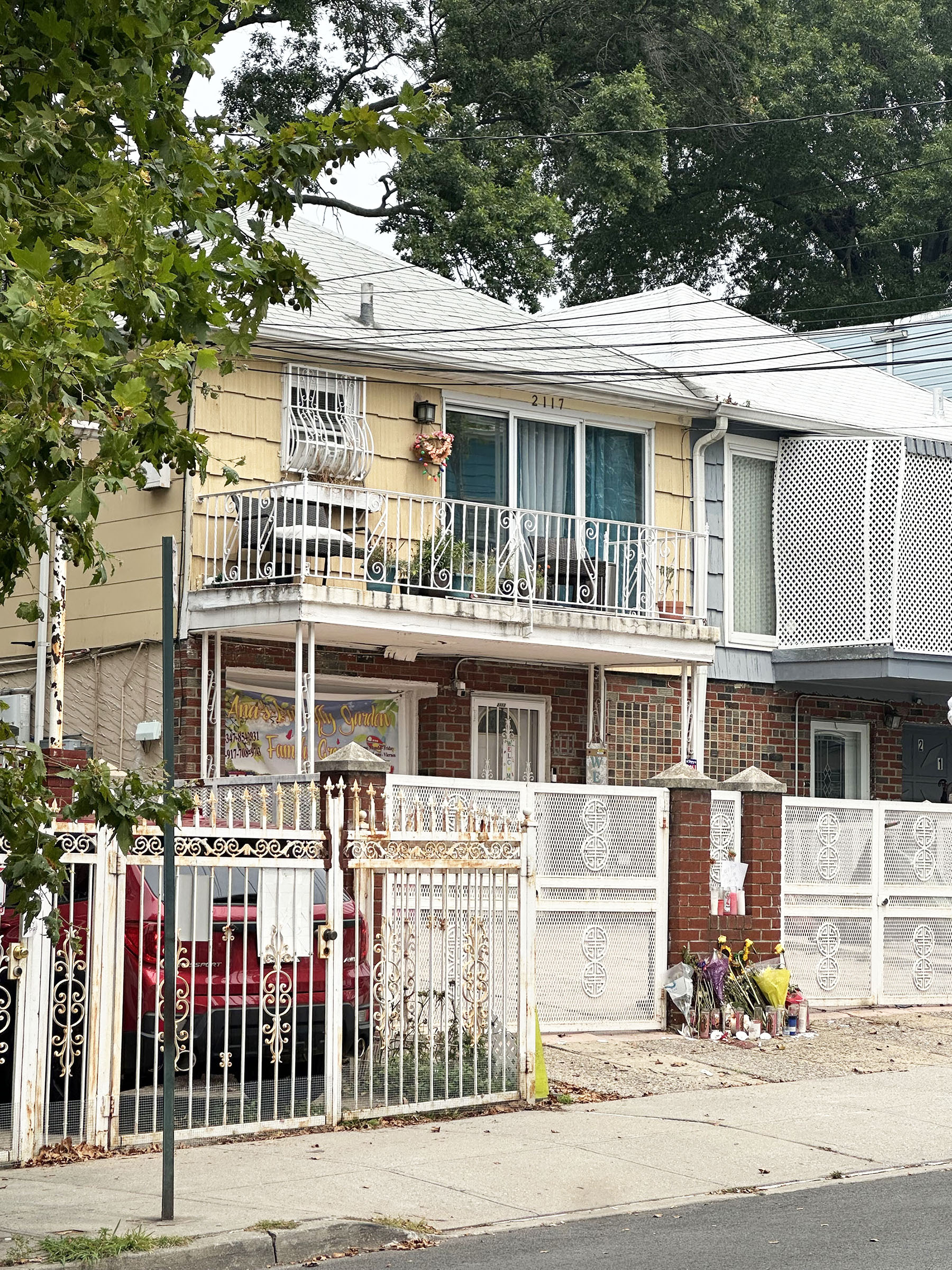 FLOWERS ARE SEEN outside 2117 Story Avenue in the Unionport section of The Bronx on Wednesday, Aug. 6, 2025, in memory of River Edima Wilson, who reportedly drowned at a daycare located at this address on Friday, Aug. 1, 2025.