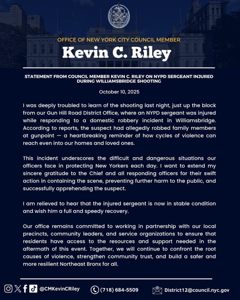 City Councilman Kevin Riley (C.D. 12) later released a statement in response to the incident which he said took place near his constituency office. He lamented the violence, thanked the NYPD and said he was relieved to hear the injured sergeant was doing ok.